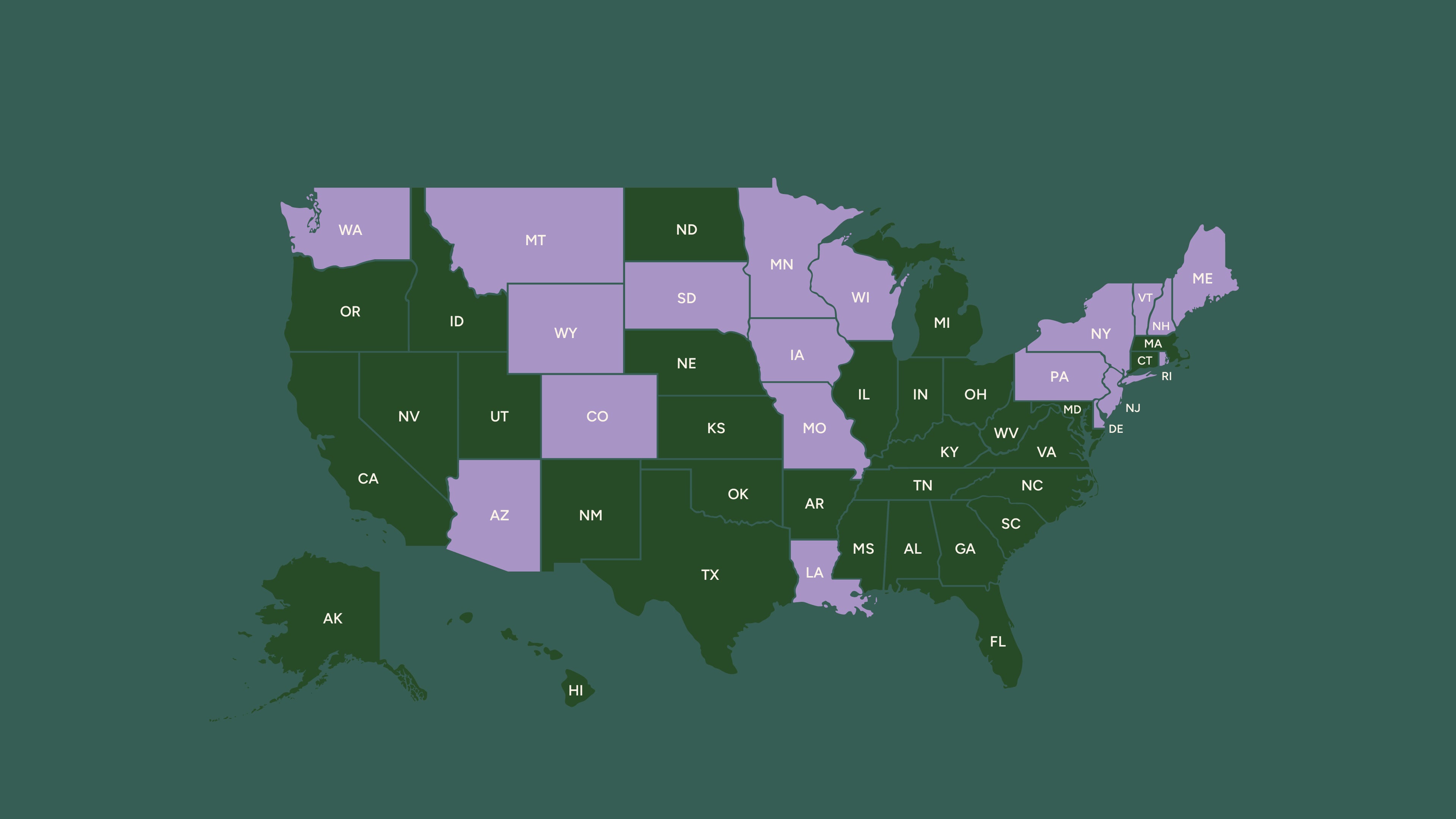 Arizona, Colorado, Delaware, Iowa, Louisiana, Maine, Minnesota, Missouri, Montana, New Hampshire, New Jersey, New York, Pennsylvania, Rhode Island, South Dakota, Vermont, Washington, Wisconsin and Wyoming.